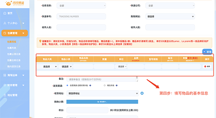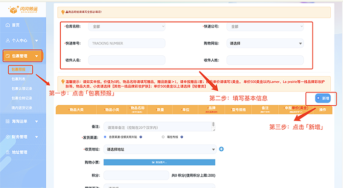 • 预报入口 :登录闪闪转运官网→进入“包裹管理”→点击“包裹预报”。