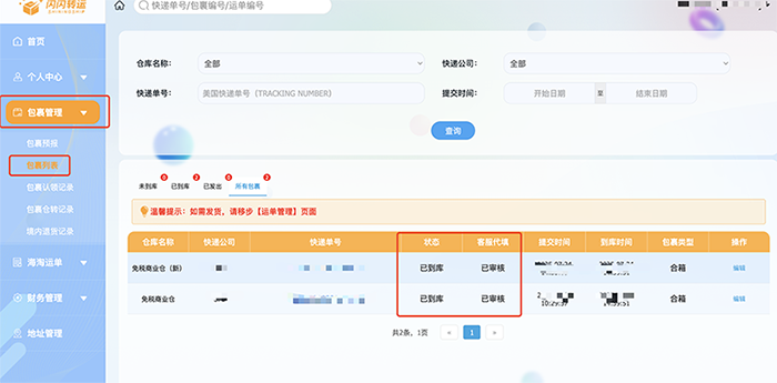 • 查状态 :预报后,回到“包裹管理”→“包裹列表”,关注状态变化。当显示“已入库”+“已审核”,说明仓库已确认包裹无误,可以申请发货啦!