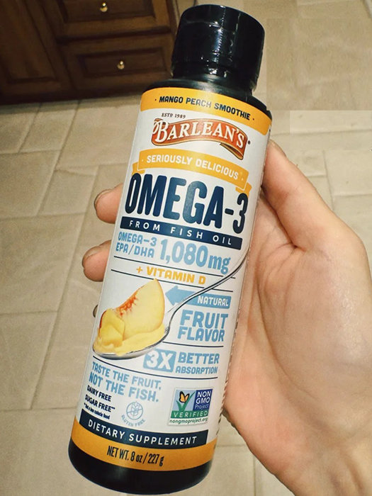 8. Barlean's 芒果桃子味鱼油功效:Omega-3(EPA/DHA 1080mg)加维生素D,3倍更好吸收。